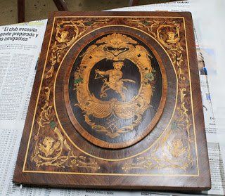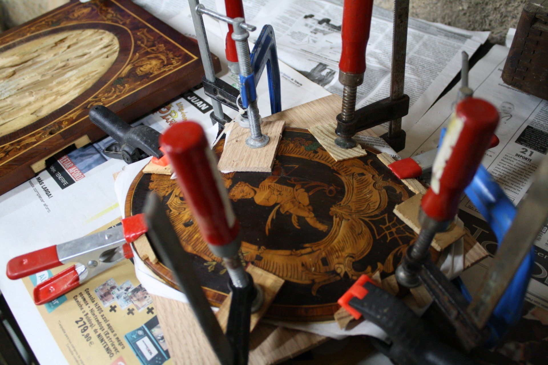 Cuando llegó al taller presentaba gran deterioro producido por el ataque de insectos xilófagos (termitas), pérdida de chapilla y suciedad acumulada sobre los acabados. Además los rebarnizados habían ocultado el color original de la marquetería y los bronces al haberse ido oxidando con el paso del tiempo.