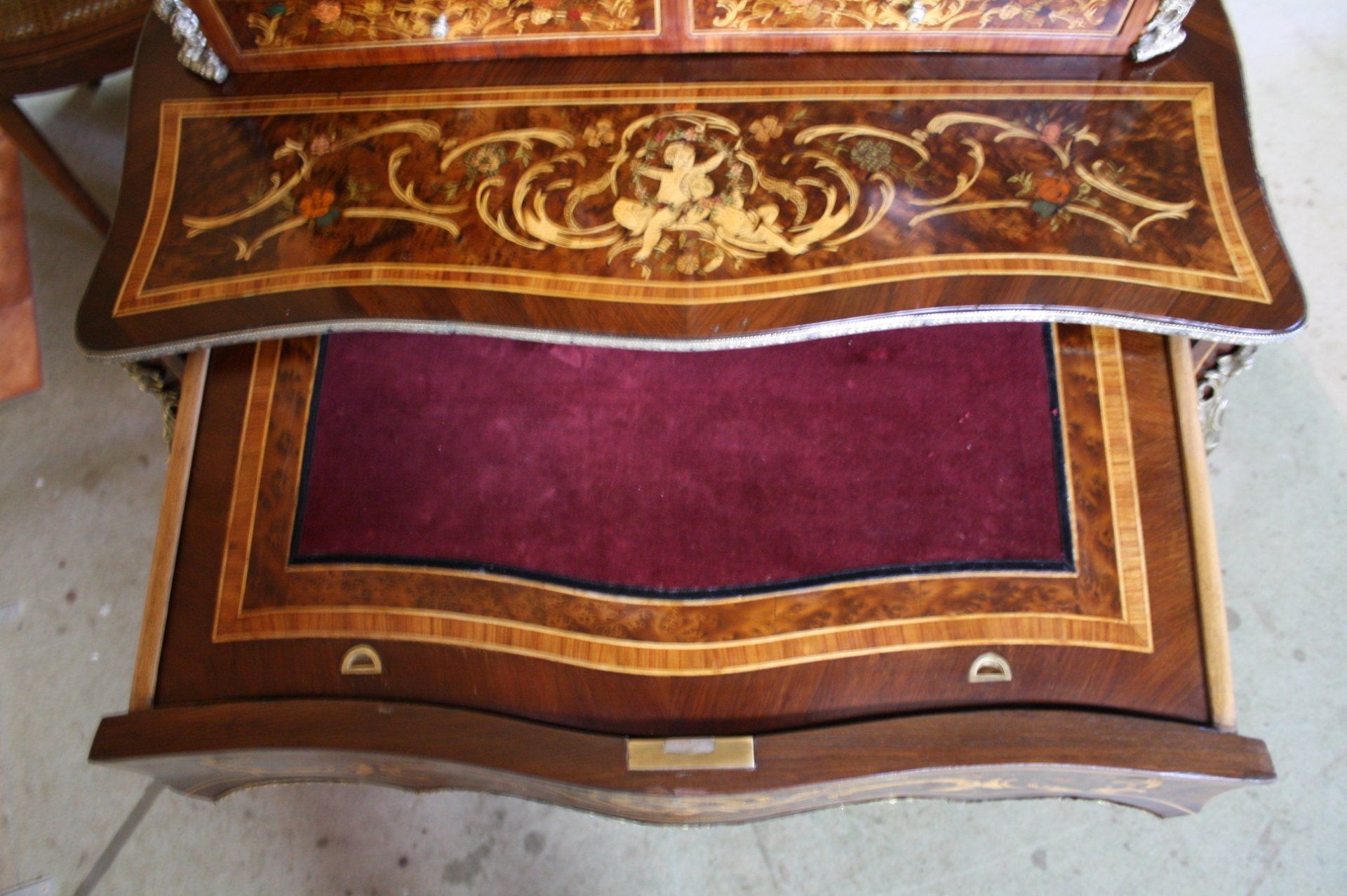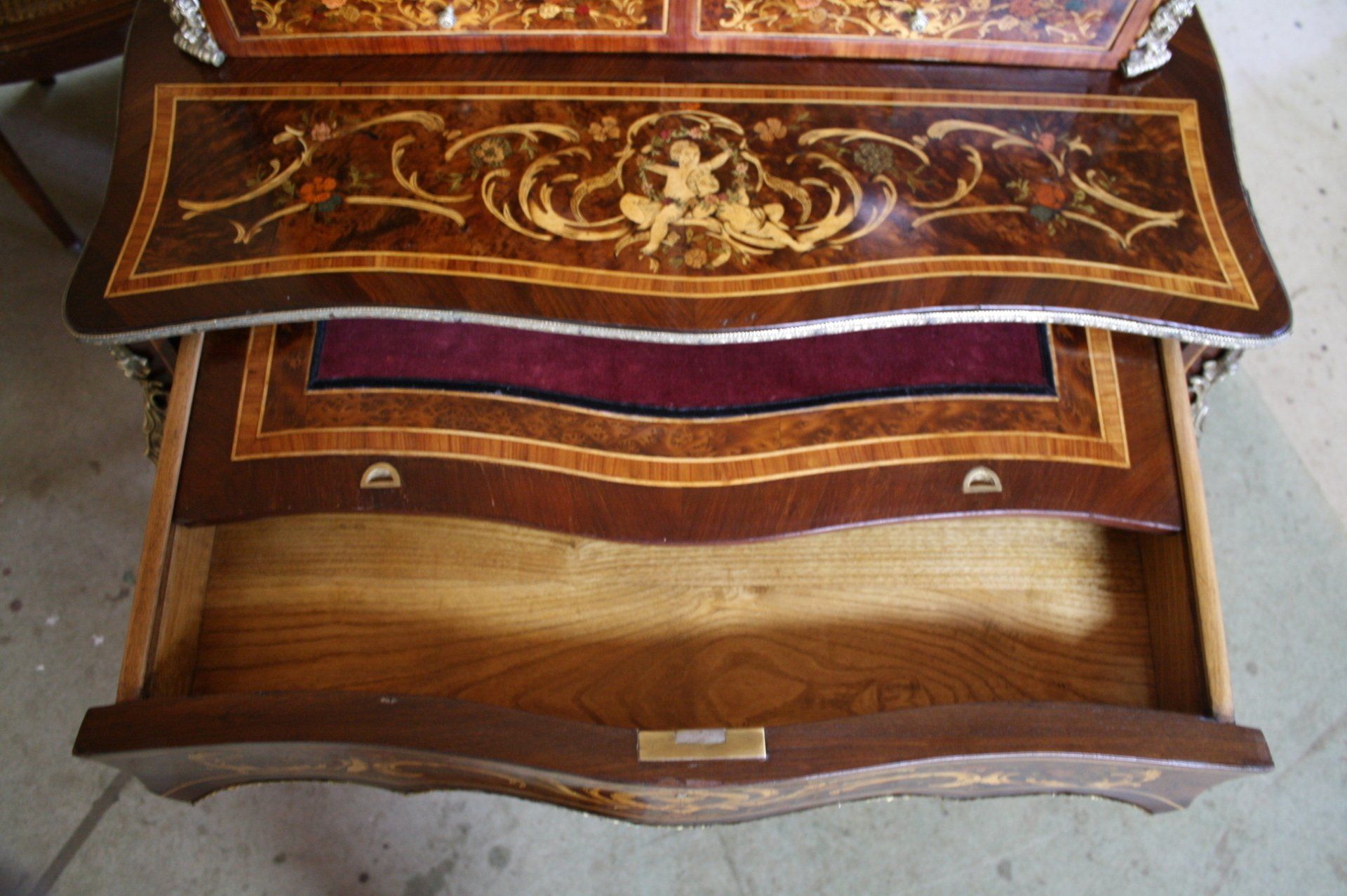 El mueble está decorado con marquetería (puttis, flores y guirnaldas) y apliques de bronce. Consta de dos cuerpos: una mesa de patas cabriolé con gaveta, con tabla de escritorio corredera y un cuerpo superior con dos pequeñas gavetas, dos puertas y estantes.